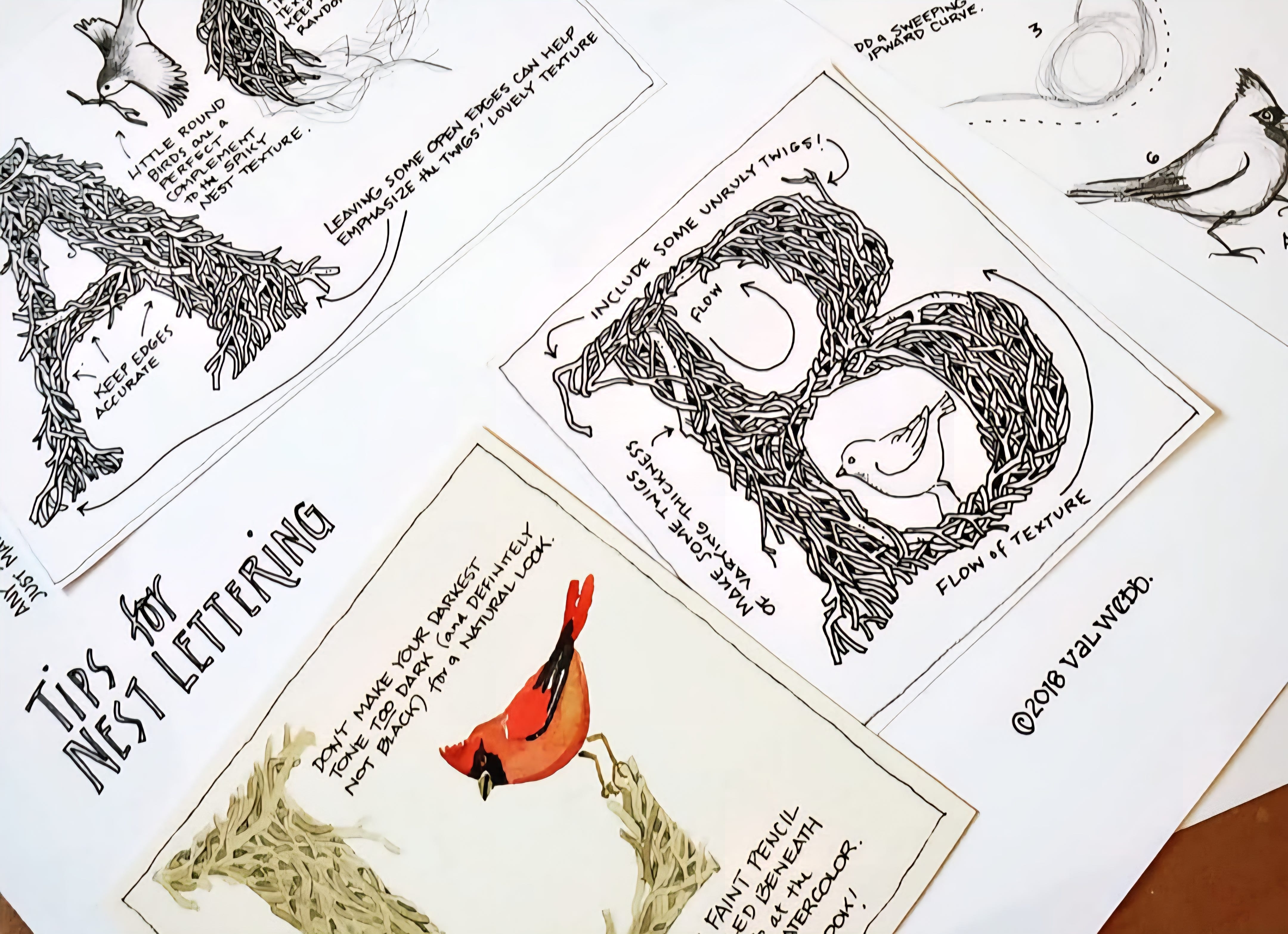 Is there anything cozier and more appealing than the image of a bird’s nest? Each is a marvel of architectural ingenuity… and their twiggy textures are fun to draw. Today, we’ll create illuminated letters that borrow their textures from the nests of birds. From the same first step, you can create in either ink or watercolor - we will do both today.