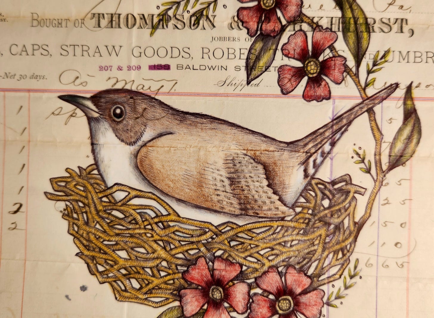 From my lesson archives: Sweet house wren in ballpoint on an antique invoice