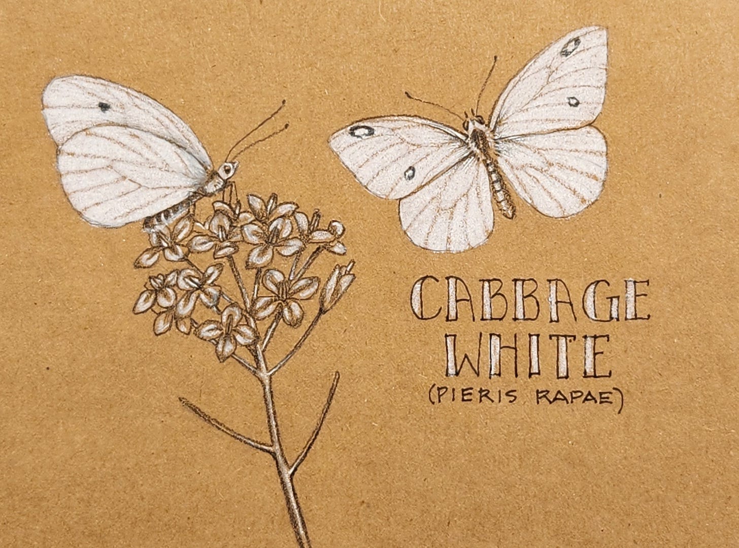 Remember Eric Carle’s classic children’s book, The Very Hungry Caterpillar? It could have been written about today’s drawing subject, the cabbage white (Pieris rapae). Despite a woefully short adult lifespan of less than two weeks, every female lays an average of 700 eggs… which soon become 700 ravenous caterpillars craving turnips, cauliflower, broccoli, mustard greens and nasturtiums. In a single season, one butterfly can produce more than 30 million great-grandchildren! So tiny, fluttering snow-white wings are never a welcome sight in the garden patch.